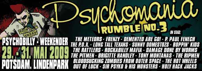 KLINGONZ . INTERVIEW * MAD SIN . INTERVIEW * HORRORPOPS . INTERVIEW * TOM TOXIC & DIE HOLSTEIN ROCKETS . INTERVIEW * MESSERSTECHER HERZENSBRECHER . INTERVIEW * ROCHEE AND THE SARNOS . INTERVIEW * SILVERSHINE . INTERVIEW * TENNESSEE MENACE . INTERVIEW * BRIGITTE HANDLEY . INTERVIEW * NIGEL LEWIS . INTERVIEW * PSYCHOMANIA RUMBLE NO. 1 . PICTURES * ZOMBIE WALK . STORY * DIARY OF SINNERS . INTERVIEW * FRENZY . INTERVIEW * RICH TASTE . INTERVIEW * GUANA BATZ . INTERVIEW * P.O.X. . INTERVIEW * FRANCINE . INTERVIEW * PSYCHOMANIA RUMBLE 2 . PREVIEW * JOHNNY NIGHTMARE . INTERVIEW * DEEPSIX . INTERVIEW * SHADOWBIRDS . INTERVIEW * GRISCHA . INTERVIEW * MAD DOG COLE . INTERVIEW * HELLSEEDS . INTERVIEW