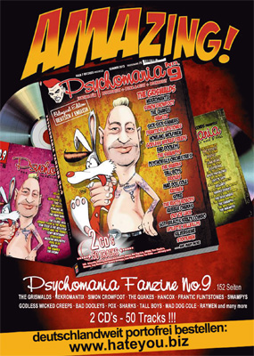 Nach wie vor dreht sich hier alles um Musik aus dem PSYCHOBILLY–PUNKABILLY–ROCKABILLY– Bereich…diesmal ist das Heftchen noch dicker und fetter als beim letzten Mal. Insgesamt kommen wir auf 56 Seiten und 25 Songs auf dem beiliegenden PSYCHOMANIA Sampler. Außerdem haben wir die Auflage auf 2000 Stück verdoppelt, so dass vorerst kein Engpass zu erwarten ist. Am Preis ändert sich deshalb nix…auch hinsichtlich kommender Merkelsteuer und sonstiger unangenehmer